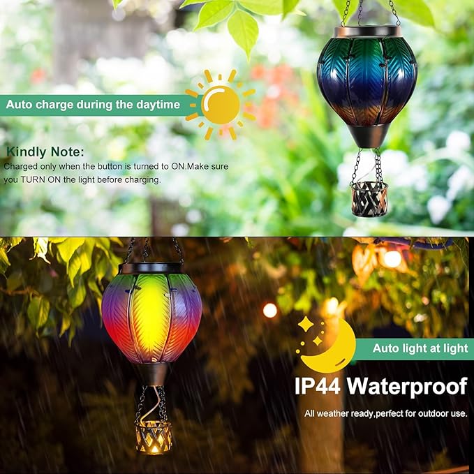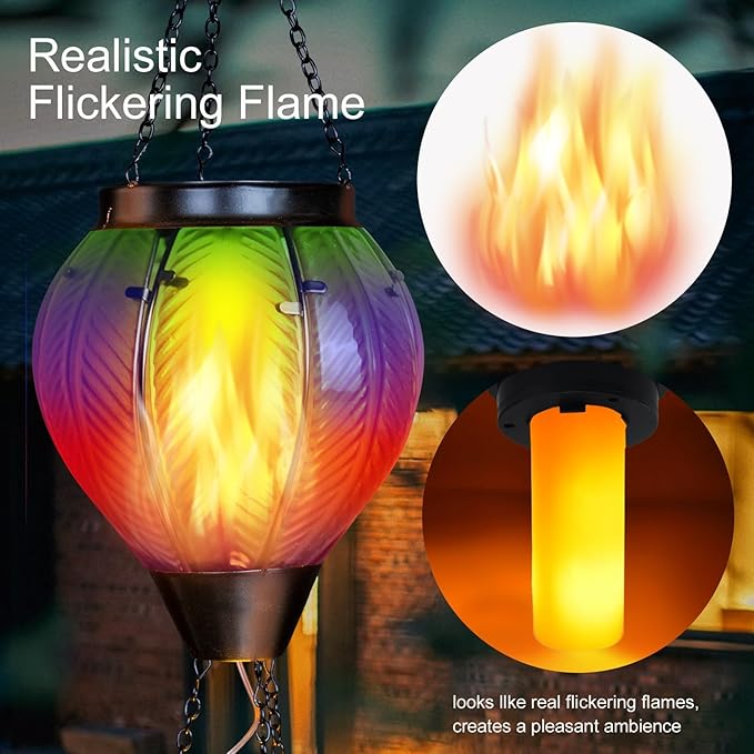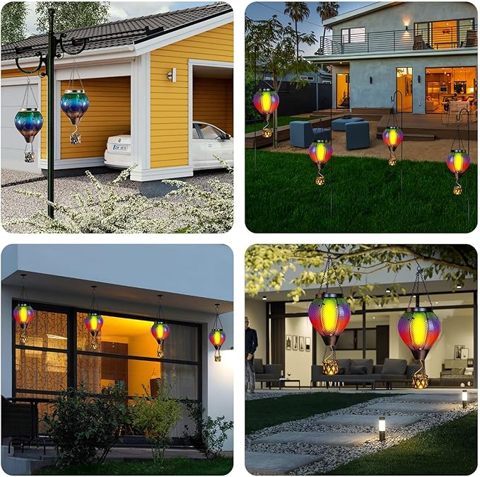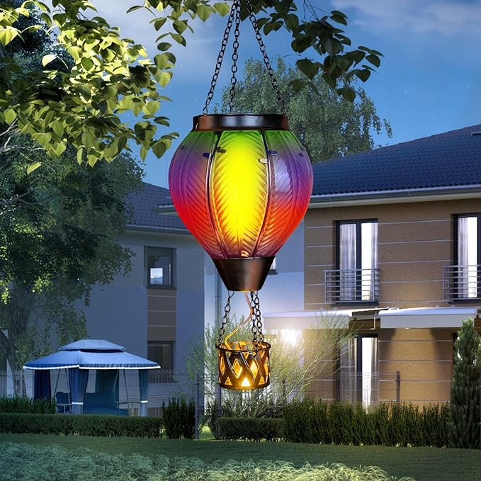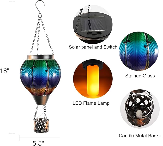 - Upgrade Hot Air Balloon Design:Our solar lanterns have been upgraded with unique hot air balloon shapes, flickering flame lights, and led candles in baskets. When solar hot air balloon flickering flame hanging garden light is on, it is like a hot air balloon rising, giving people a visual shock, giving people warmth and faith.
