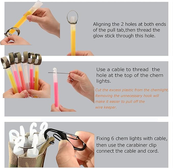 - Included Components : chem lights, Carabiner Clip, keychain cables, pull tabs