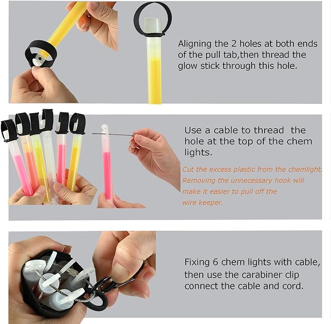 • 【Easy Organization of Chem Light Pouch】: The chem lights keeper includes 6pcs chem lights(random color),one Carabiner Clip,2 keychain cables and six pull tabs,featuring two different variations (smooth and serrated)