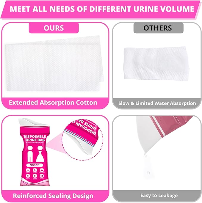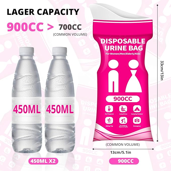 - Strong Seal, Large Capacity Up To 900ML: Our urine bags offer 200ml more capacity than standard ones, providing ample space in emergencies. Whether you're traveling with kids or seniors, our disposable urine bags are perfect for storing urine or vomit, especially long-held urine or larger amounts of vomit, they can accommodate and absorb liquid all. The unique opening makes them easy to use, ideal for all outdoor waste disposal needs