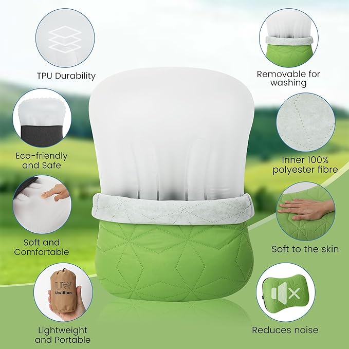 Inflatable Camping Pillow with Removable Cover - Ultralight Inflatable Pillow for Camping Lightweight, Ergonomic and Washable for Camping, Hiking, and Travel Green