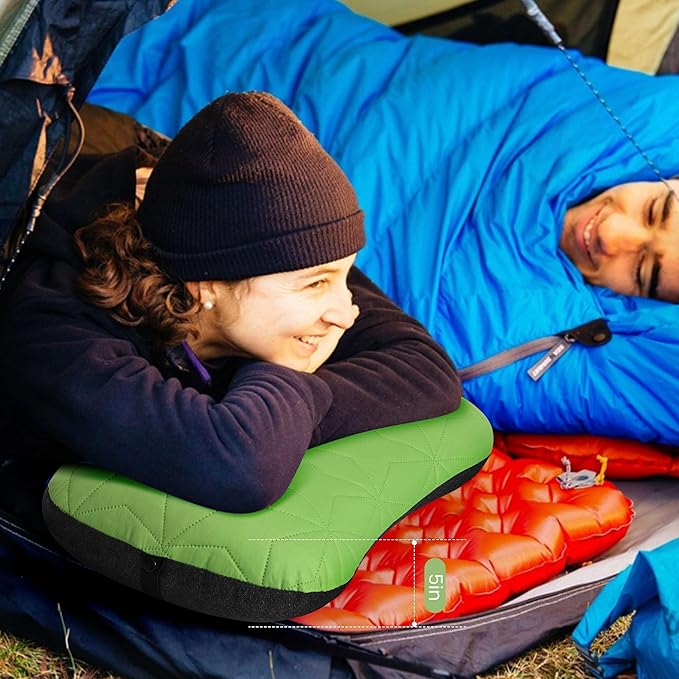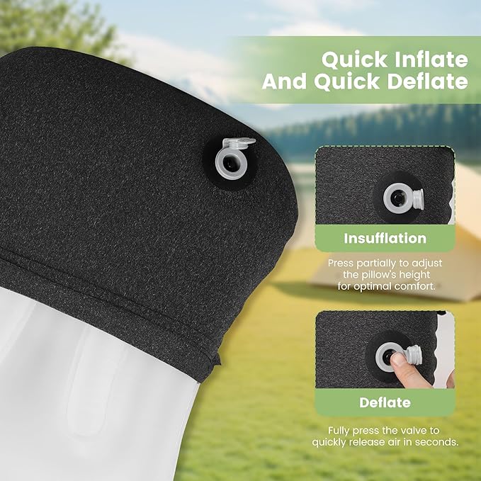 - Easy Inflation Valve - The unique one-button valve design makes inflation incredibly simple. With just 5-8 breaths, the pillow is fully inflated without the need to press a button. To deflate, just press the button, and the pillow releases air in seconds. Adjust the pillow's height and softness to your preference, providing home-like comfort even in the great outdoors