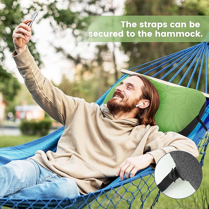 - Ergonomic Design - Whether you're a back sleeper or side sleeper, this inflatable camping pillow provides superior neck support with its optimized height and ergonomic design. The blow up pillow contours perfectly to your neck curve, ensuring a restful night's sleep. The strap design pairs perfectly with air mattresses or cots, preventing the pillow from shifting during the night. It also doubles as an inflatable lumbar pillow, providing relief from back discomfort caused by prolonged travel or work
