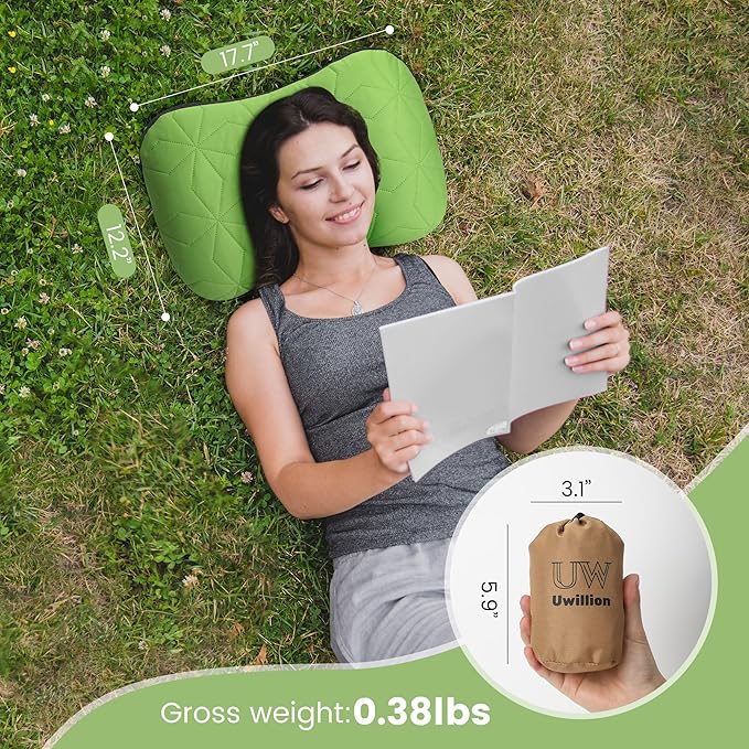- Compact and Portable - Designed for adventurers on the go, this inflatable camping pillow folds down to just 5.9" x 3.1", ultralight weight design in 0.38lbs. Its compact and lightweight design makes it easy to carry, whether you're backpacking, camping, or on a business trip. Simplify your packing with this portable pillow, ensuring comfortable head or lumbar support whenever needed