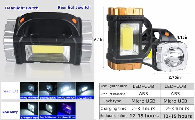 - 【Water-resistant & Portable & Easy to Use & Free USB cables 】 This work light water resistant level is IPX-4 , no matter in heavy rain or thick fog, but can't put it into water directly. The flashlight rechargeable is made of high-strength ABS plastic, At the same time, the flashlight itself is small and light, which is easy to carry outdoors. Just press or hold the button to adjust to the light mode and brightness. Complimentary USB cable.