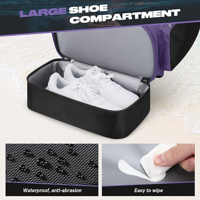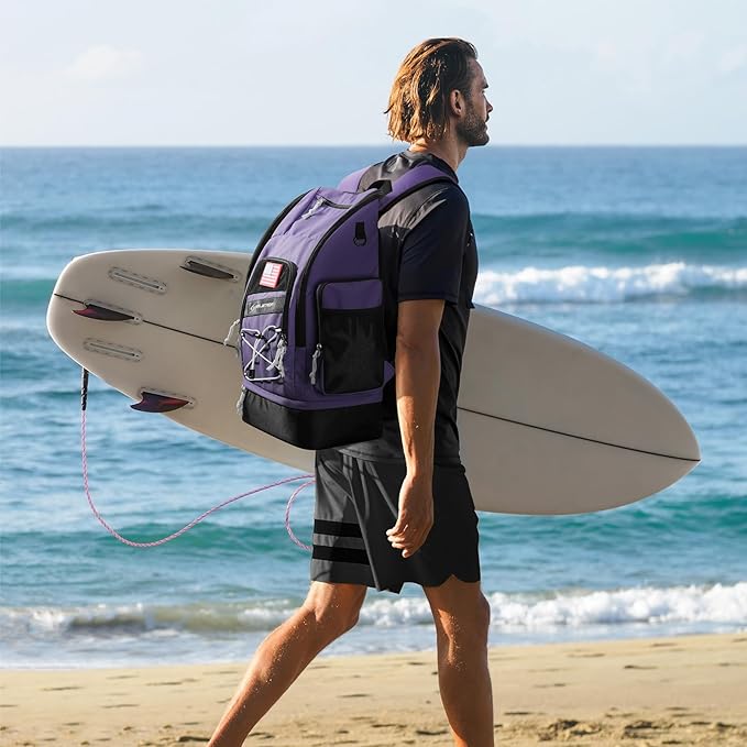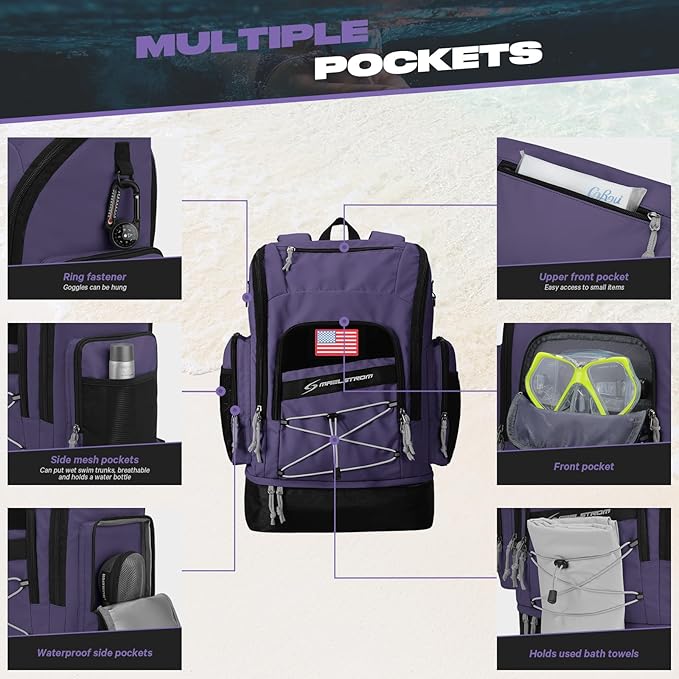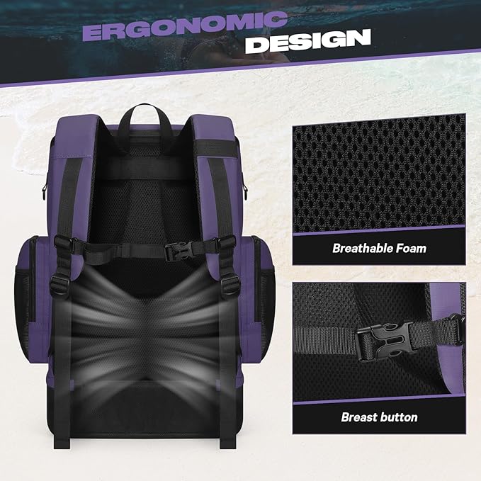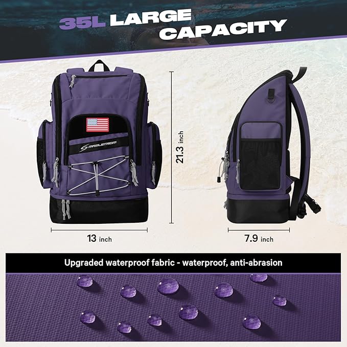- Waterproof & Spacious: Our swimming backpack is crafted from upgraded waterproof polyester, ensuring durability against water and wear. With a generous 35L capacity, it accommodates all your swimwear, activewear, and training gear.