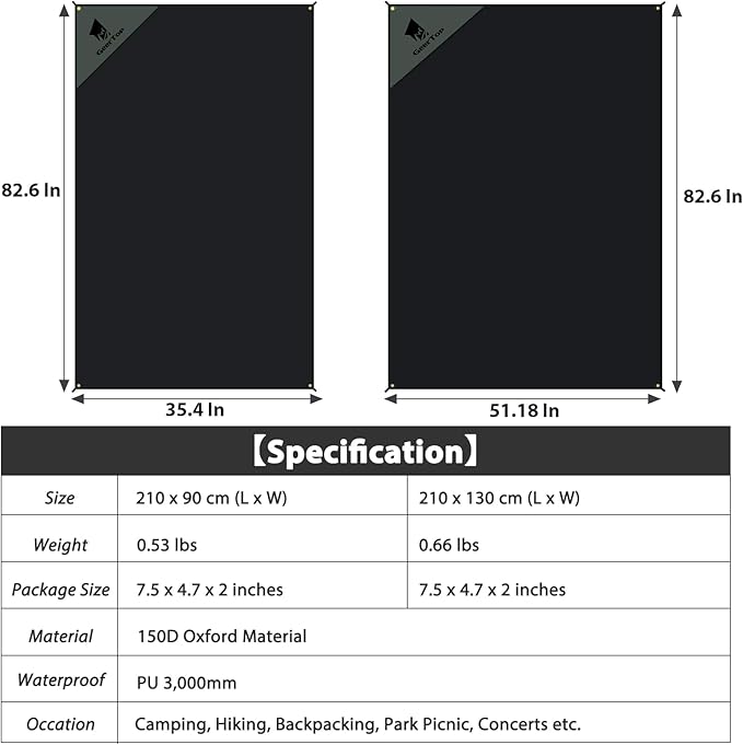 - 【Waterproof Ground Cover】With a waterproof rating of up to PU3000 MM, this ground mat offers superior water resistance, keeping the tent sleeping area or vestibule dry and minimizing internal condensation in inclement weather conditions