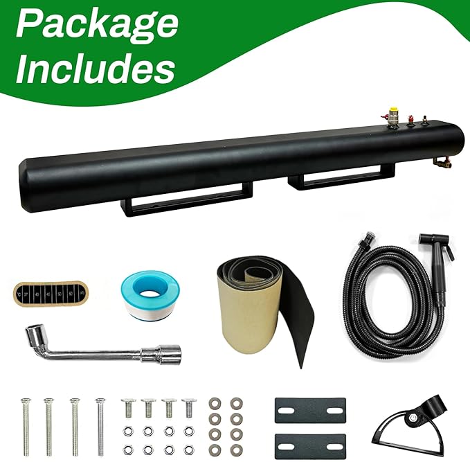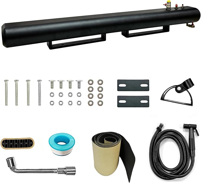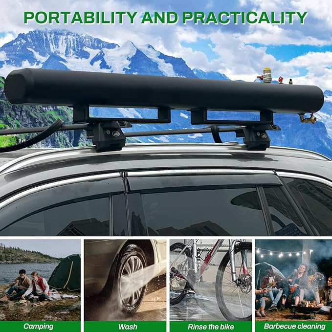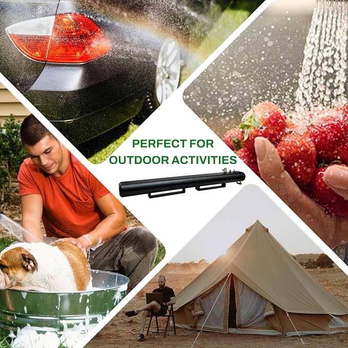 - 🏆【Good Material】Our pressurized water tank is made from all aluminum so it's not going to buckle or warp in the sun. Road camping shower water tank use black coating with durable. Its mat black absorbs heat, even cold water gets hot after just a couple hours in moderate sun.