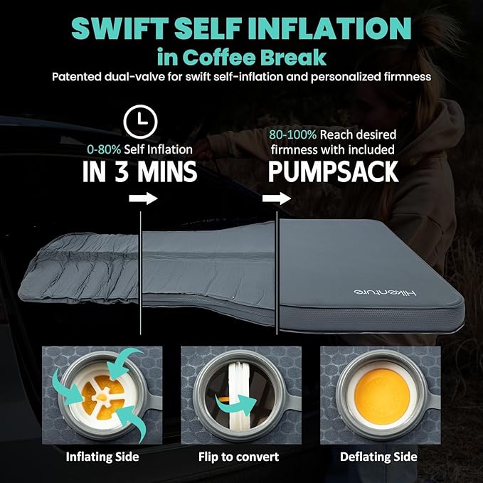 - 𝗧𝗜𝗖𝗞𝗘𝗧 𝗧𝗢 𝗜𝗡𝗦𝗧𝗔𝗡𝗧 𝗥𝗘𝗟𝗔𝗫𝗔𝗧𝗜𝗢𝗡 - Enjoy the ease of our camp mattress with innovative double-sided valve, designed for effortless self-inflation and deflation, preventing any backflow. Just a simple flip and our self inflating camping pad springs to life in minutes. The dual-purpose carry bag serves also as pump sack which enables you to adjust the car sleeping pad's firmness to your personal taste.