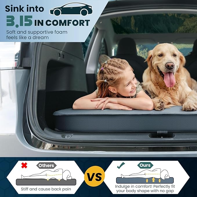 - 𝗘𝗟𝗘𝗩𝗔𝗧𝗘 𝗖𝗢𝗠𝗙𝗢𝗥𝗧 𝗢𝗡 𝗧𝗛𝗘 𝗥𝗢𝗔𝗗 - Transform your Model Y into a cozy haven anywhere, anytime! With a unique combination of 3.15 INCH thick foam and air, our camping sleeping pad can effortlessly support up to 440 pounds, and is fully adjustable for personalized softness and support, ensuring a higher level of comfort and a restful night's sleep for all sleeping positions.