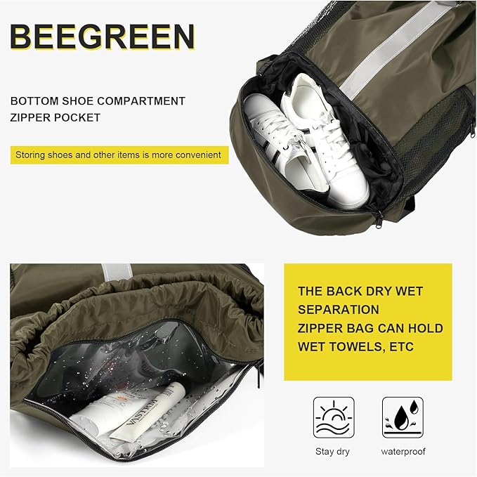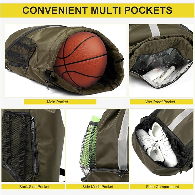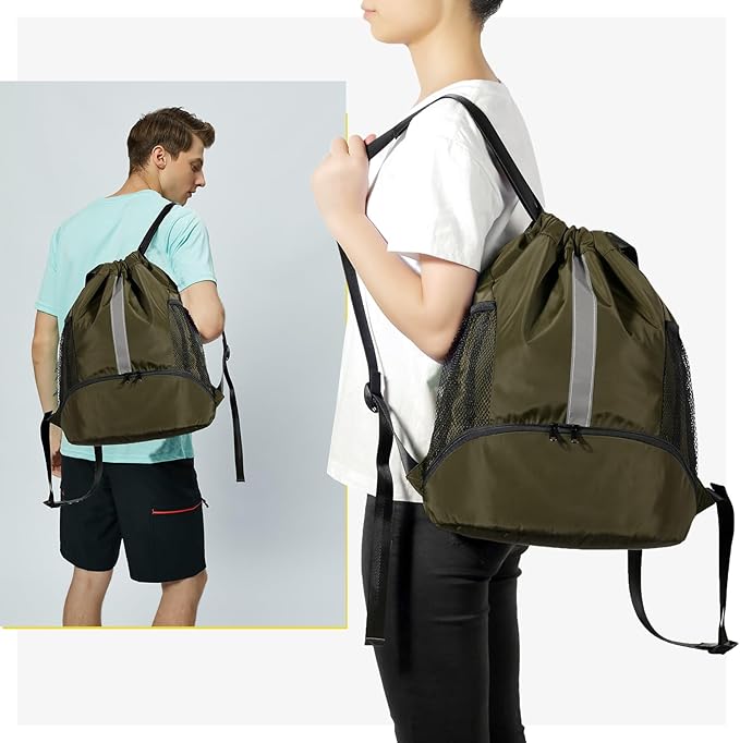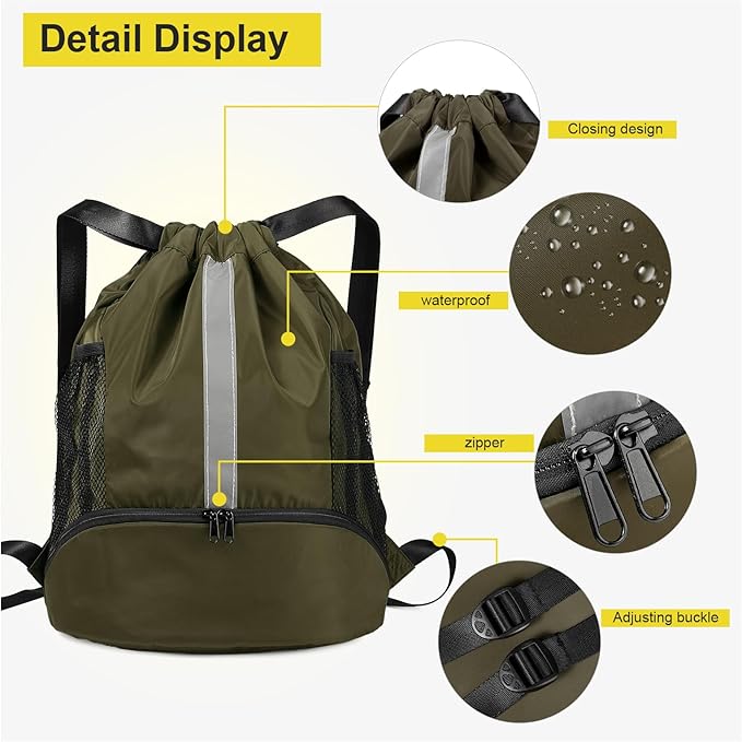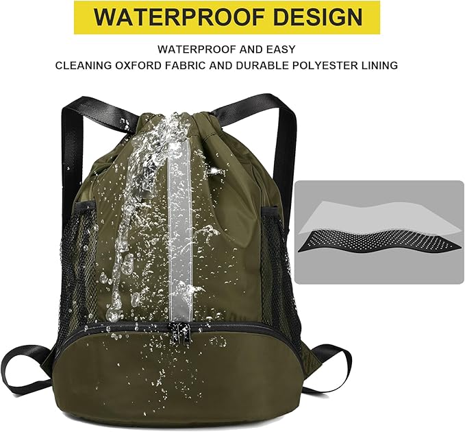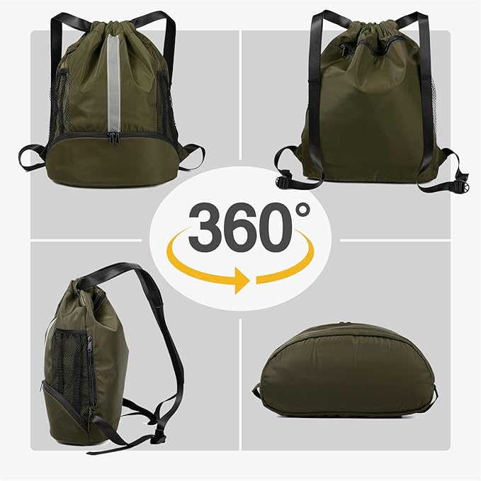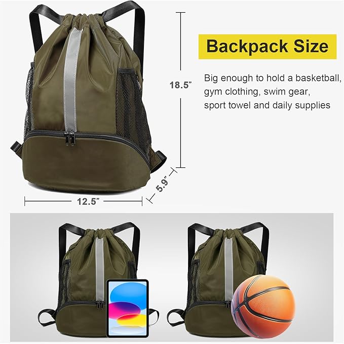 - SEPARATE WET POCKET & SHOE COMPARTMENTS: This drawstring bag has a wet pocket on backside for storing damp items like toiletries and wet towels, keeping other items dry and organized. And there is an enlarged shoe pocket at the bottom, which is perfect for storing sneakers or high-top basketball shoes.