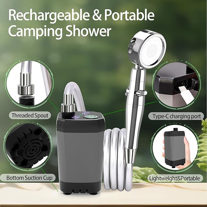 - 🚿 6000mAH Large Capacity Battery Camping Shower: Portable camping shower comes with upgraded high capacity 6000 mAh battery water pump, long lasting working time up to 120-150 minutes for 3-6 persons shower needs. Rechargeable and lightweight portable features make it your best choice for camping. The water pump uses type-c port to input power and four suction cups at the bottom make it stable in the bucket