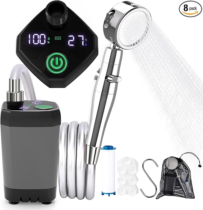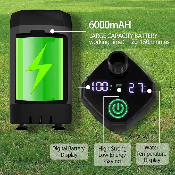 - 🚿 Upgraded LED Display Camping Shower: The camping shower water pump LED display provides a clearer and more intuitive indication of the power level as well as displaying the water temperature figure for a range of 32-140° F. The camping shower pump screen allows you to find the right water temperature for you and avoid power outages in the middle of the day