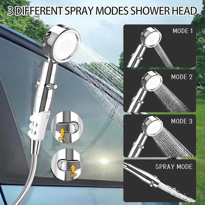 - 🚿 3 Different Camping Shower Modes: The portable should also shower head comes with a separate on/off switch with three water dispensing modes and an adjustable water flow rate, or you can remove the top of the shower head to use it. You are free to adjust the desired water pressure and mode while taking a camping shower, or use it for watering the grass and washing the car after removing the shower