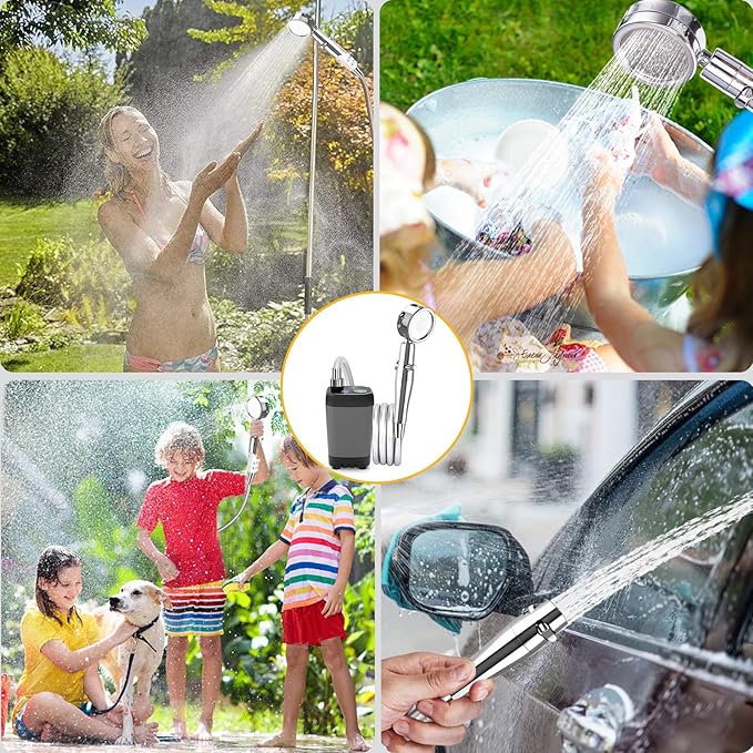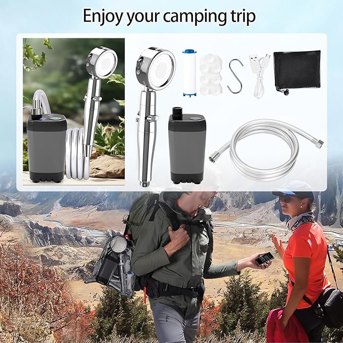 - 🚿 Accessories Complete And Easy To Carry: The portable camping shower kit contains 1*water pump, 1*shower head, 1*1.8m water hose, 1*suction cup, 1*filter cartridge, 1*S hook and a mesh storage bag, easy to carry and store. Suitable for indoor/outdoor shower, camping, barbecue, hiking, beach, traveling, children's bath, pet cleaning, car washing and garden watering