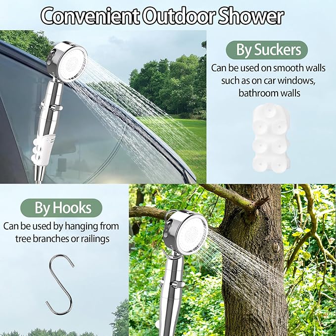 - 🚿 Premium Adjustable Camping Shower Head: The portable camping shower head chooses a high-quality pressurized shower head, with fine and even water holes, and delicate and stable water discharge. Suction it on the car window or hang it on an outdoor tree branch, easily enjoy a great shower experience