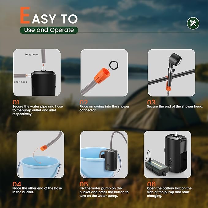 - 【Easy to Assemble and Operate】Our electric outdoor shower is very simple to use, just connect the tube to the pump and shower head, place the suction tube in the bucket, then press the button to turn on the pump, and it will create a steady, gentle shower flow. This camping shower can be used to rinse your feet after playing at the beach, and is also ideal for outdoor sports, hiking, children's showers, pet cleaning, garden watering, car washing, swimming, etc.