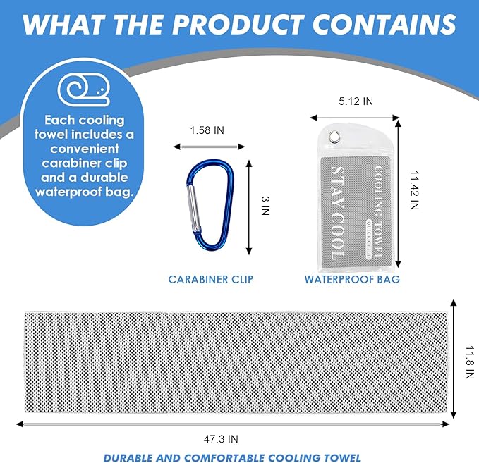 - DESIGN FEATURES : Measuring "47x12", the cooling towel offers ample coverage; Expanding the size brings better cooling effects; Crafted from high-quality materials, these towels are durable and longevity, providing a dependable, cost-effective cooling solution for the long term; Please feel free to contact us for any issues