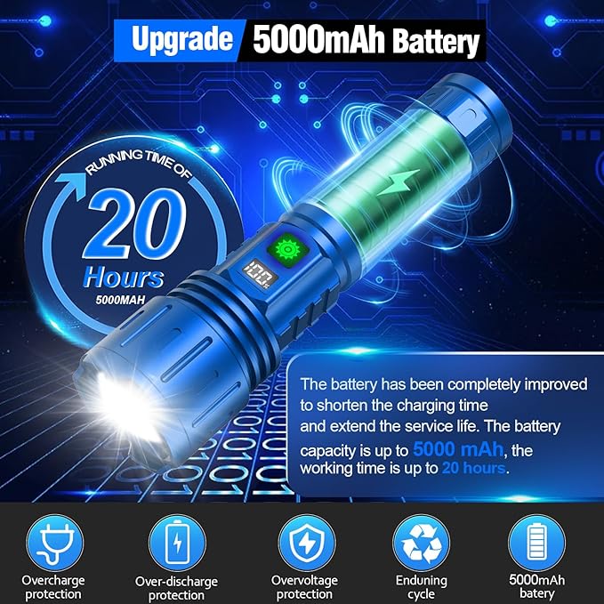 Flashlights 20000 High Lumens Rechargeable - 1500 Meters Long Beam Super Bright LED Flash Light with Power Display & IPX5 Waterproof for Camping, 20H Runtime,5 Modes,Zoomable Handheld Flashlight-Blue