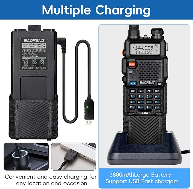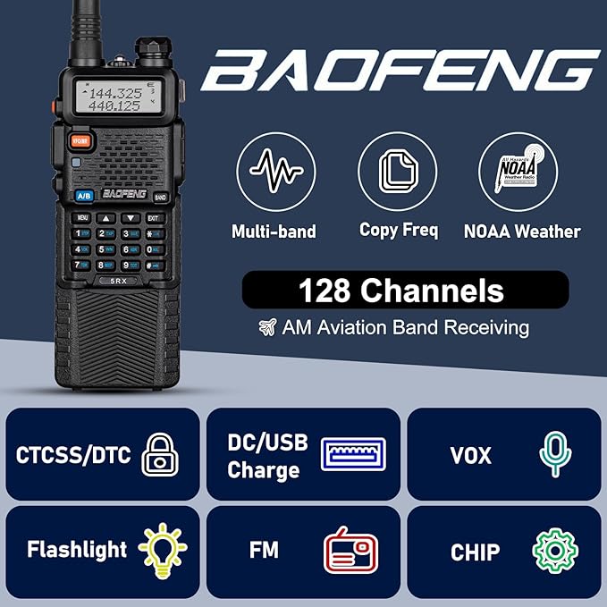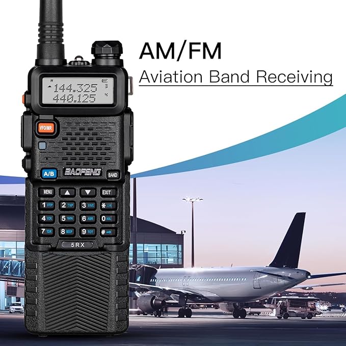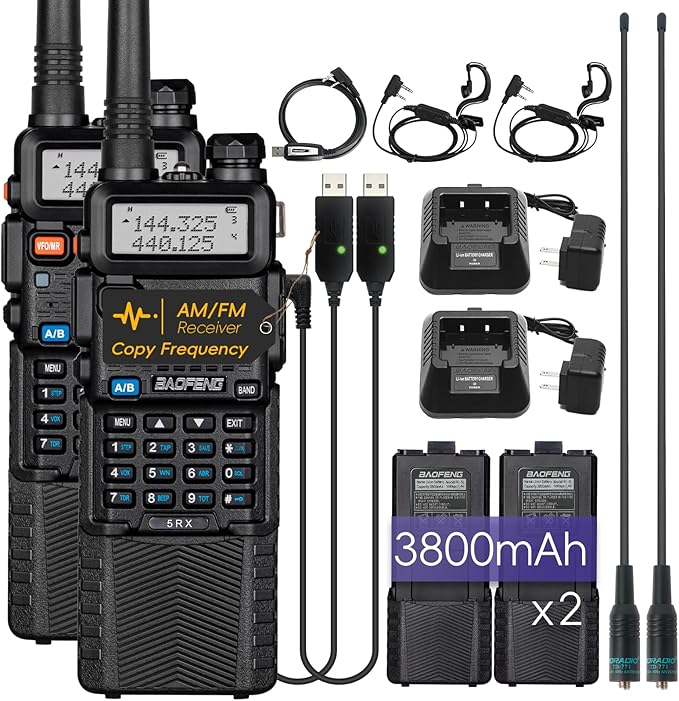 - [Upgraded of UV-5R]: Features a more powerful transmitter and larger antenna for communication at a line-of-sight distance of up to 5 miles and reception on the AM/FM bands and Weather Alert.(FCC ID: 2AJGM-5RX).
