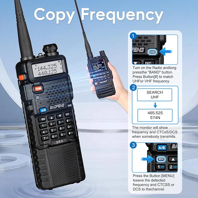 - [Copy Frequency]:Simple and convenient, Just three steps of one key frequency copying operation allows you to quickly talk to a nearby raido.