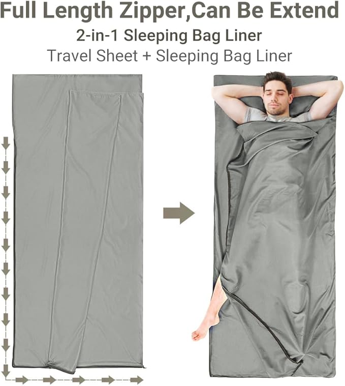 - Full Length Zipper - Our sleeping bag liner is designed with a convenient full length zipper that extends to the side and bottom for easy access. If fully unzipped, it can also be unfolded to use it as a spacious bed sheet. It's a great partner for your hotel or hostels stay!