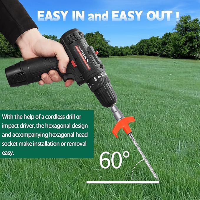 - Easy In And Easy Out: With the help of a cordless drill or impact driver, the hexagonal design and accompanying hexagonal head socket make installation or removal easy. LISMODZ camping stakes are easy to drive in and haven't budged! Very easy to put in rocky soil.