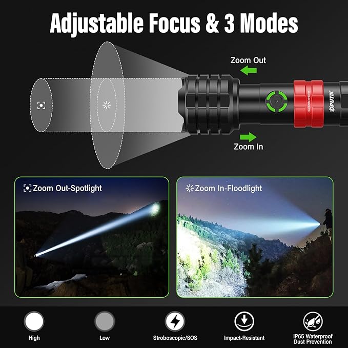 - 3 Lighting Modes & Zoomable Function 🔦 This LED flashlight has high,low,strobe lighting modes.Scalable adjustable focal length(floodlight and spotlight).Lighting range of approximately 600 feet/180 meters,and the maximum irradiation distance can reach 660 feet/200 meters.You can choose the appropriate lighting mode according to your needs,providing you with a clear view of your surroundings.Very suitable for home and outdoor use,such as running,camping,adventure,cycling,hiking,fishing,RV travel,hurricane,earthquake, power outage,disaster relief emergency.