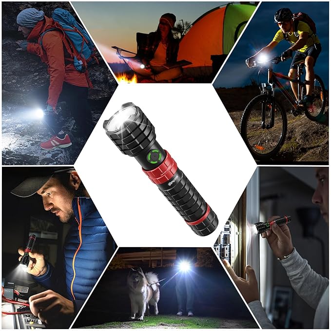 - Rechargeable Portable Flashlight & IP65 🔦 The body of the OPUTIK emergency flashlight is made of military grade aluminum alloy.IP65 waterproof performance,can be used normally in rainy,desert,snowy and other adverse weather conditions.This led high lumen flashlights has undergone experimental testing and can withstand various collisions and drops.Comfortable grip and surface thread anti slip design,waterproof,impact resistant.The diamond-shaped head structure can be used for emergency items such as window-breaking hammers.It's an essential outdoor tool.