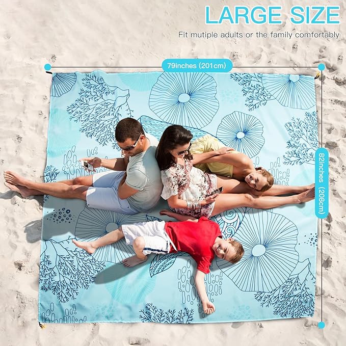 - 🏖OVERSIZED COMPACT SIZE: The size of this sand free beach mat is 79"*82", suitable for 4-7 adults. It folds in a compact bag with a length and width of only 8.07" * 4.72" and can fit into our storage bags quickly and easily.