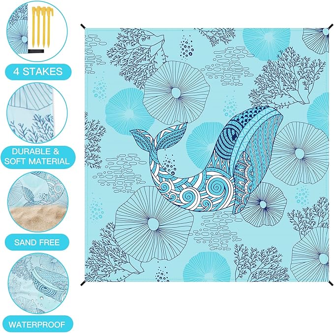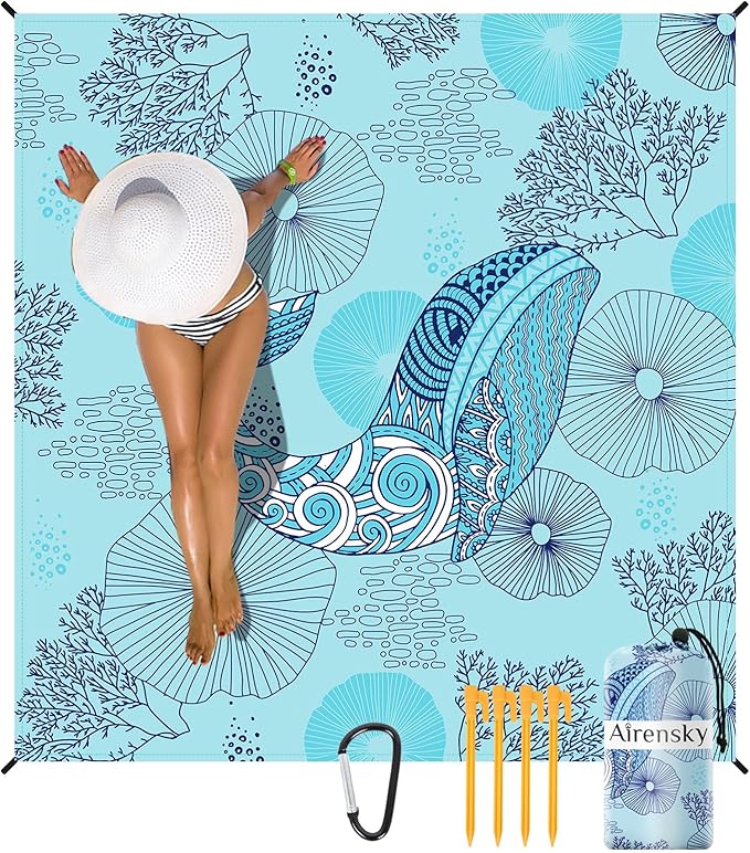 Airensky Beach Blanket, Sandproof Beach Mat 79" X 82" for 4-7 Adults, Large Waterproof Beach Blanket Quick Drying Lightweight Beach Blanket with 4 Stakes for Travel Camping Hiking(Blue Whale)