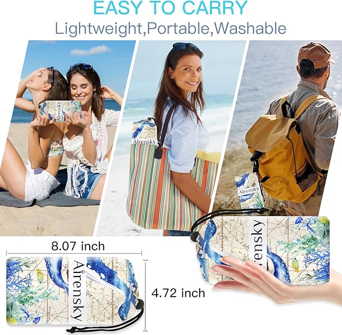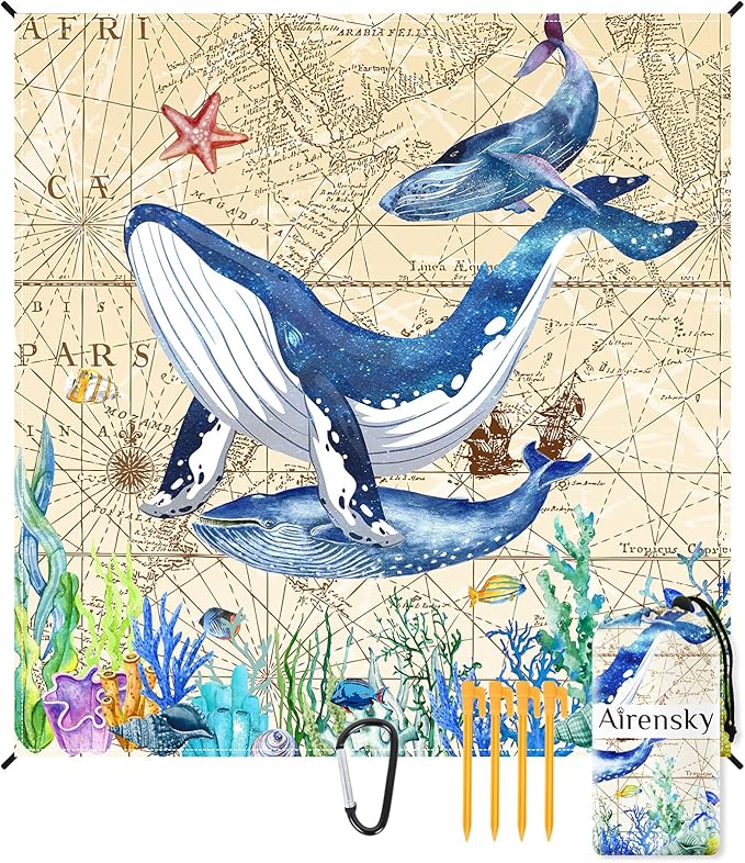 Airensky Beach Blanket, Sandproof Beach Mat 79" X 82" for 4-7 Adults, Large Waterproof Beach Blanket Quick Drying Lightweight Beach Blanket with 4 Stakes for Travel Camping Hiking(Sea World Whale)