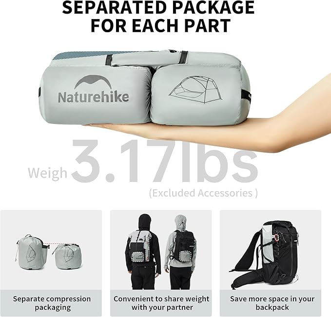 - Separated Packaging: Each part of the tent has a storage bag, the Separated compression packaging help you to save space in your backpack; The tent poles can be put into the side pocket of the backpack, or you hang it on your backpack with a hiking buckle; The design is also convenient to share weight with your partner.