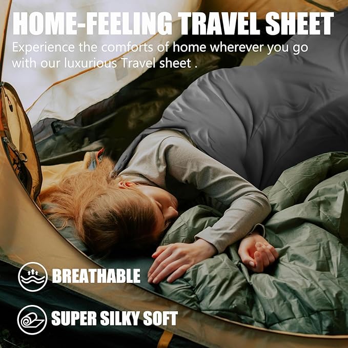 • Home-Feeling Travel Sheet: Get ready for the ultimate in comfort on your next adventure! Our luxurious Travel sheet will make you feel like you're back home, no matter where you are. They're breathable and super silky soft, so you can relax and enjoy the ride. And the integrated pillow sleeve offers additional comfort and protection, so you can sleep like a baby!