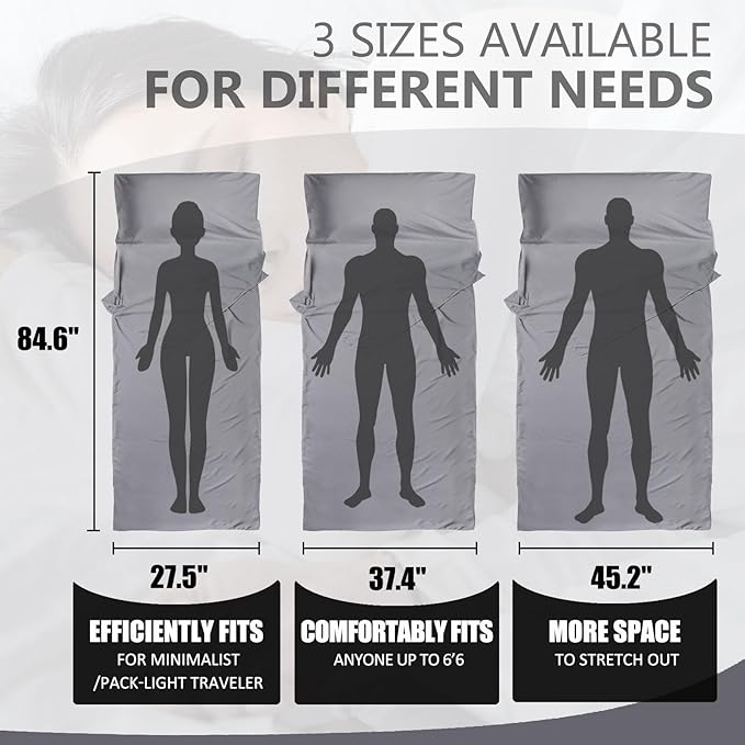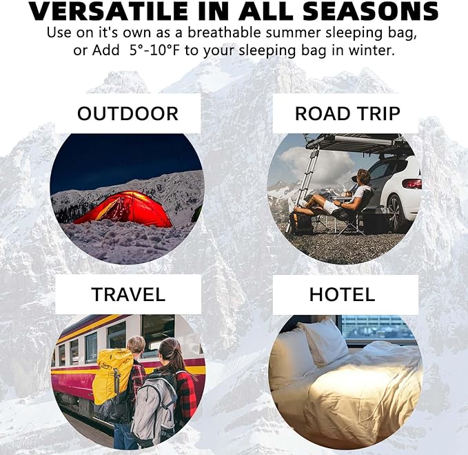 • Versatile Use: Our sleeping bag liner is the perfect addition to your outdoor sleep system or serves as a warm-weather ultralight sleeping bag. It's also the ideal companion for various scenarios. Whether you're staying in a hostel, enduring long bus rides, or embarking on plane journeys, this liner adds extra warmth and acts as a protective barrier.
