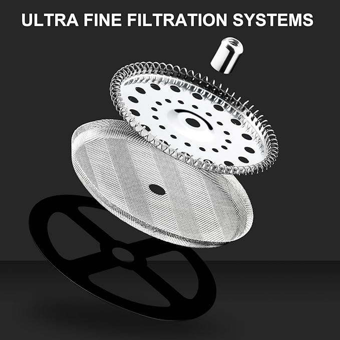 - 【Ultrafine Filter】 The filter of this french press coffee maker is made of 304 stainless steel. The thickened and dense double-layer filter effectively filters coffee grounds and tea leaves. This small coffee press allows you to enjoy smooth and rich coffee.