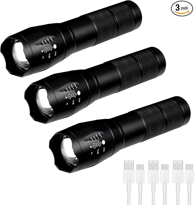 3 Pack LED Rechargeable Flashlight, Super Bright Small MiniCamping Flashlights Zoomable Beam, Convenient USB C Charging for Camping Hiking Outdoor Home Emergency