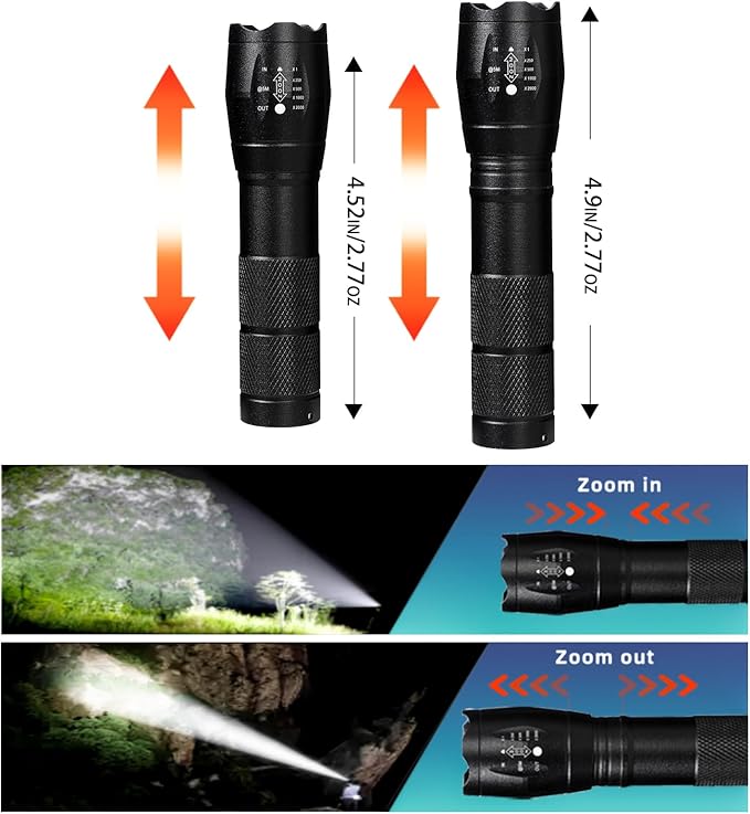 - Spotlight & floodlight: Tactical flashlights high lumens has adjustable focus function to be spotlight or floodlight, You can easily stretch led flashlight head to adjust, spotlight used for long-distance obseryation. floodlight used for large-area lighting.