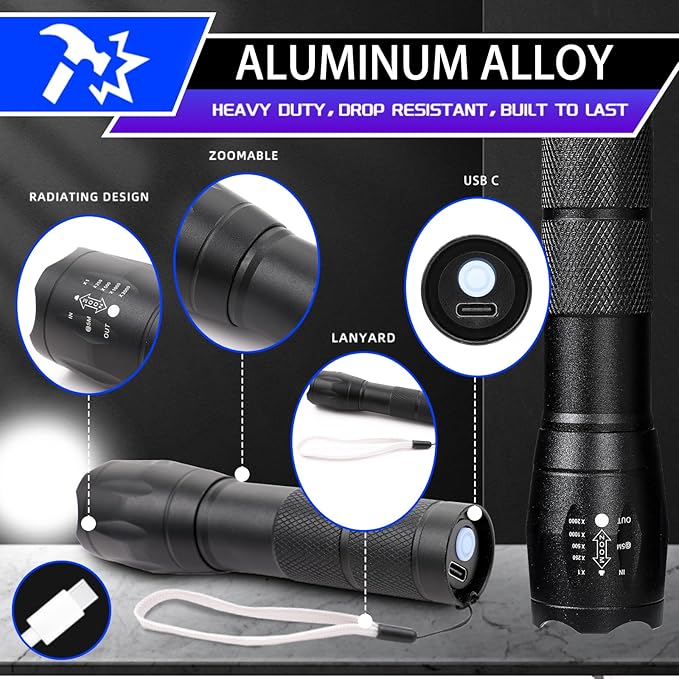 - USB-C Rechargeable Flashlights: LED flashlights contain a high-capacity rechargeable battery, for your long-time indoor and outdoor use, just a type-c cable can achieve fast charging.
