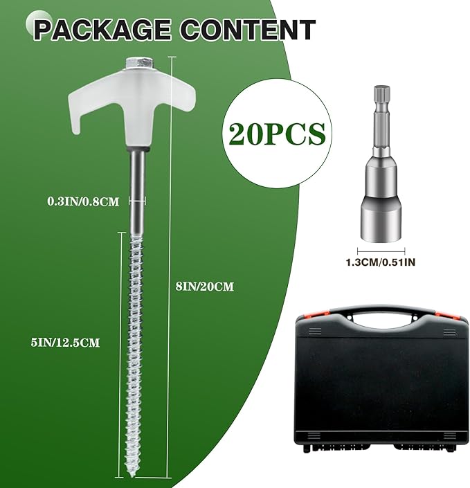 - Package Quantity and Size:20 screw in tent pegs and 0.7 inch diameter hex tool and convenient carrying case, meet your applying needs and replacement needs. Each root threaded tent stakes 8 inches/ 20 cm long, the thread is approx. 0.31 inch/ 0.8 cm in diameter