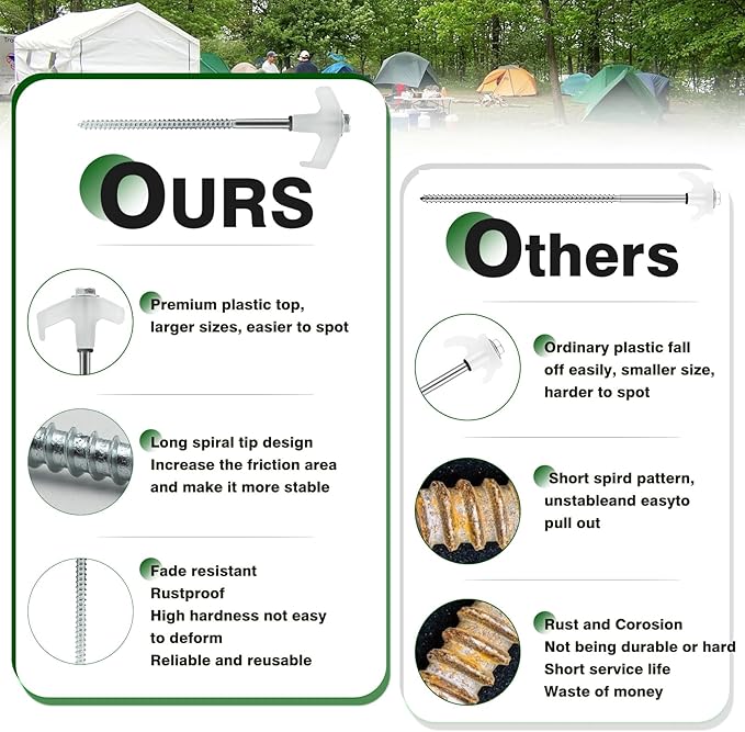 - Wide Application:Tent stakes heavy duty are designed for extra strength in windy conditions, can be applied in various occasions, awnings, shelters, patios, gazebos, canopies, tarps, picnic mats, camping tents, garden structures, landscapes, backyards, they are quite useful camping travel tools, convenient and portable