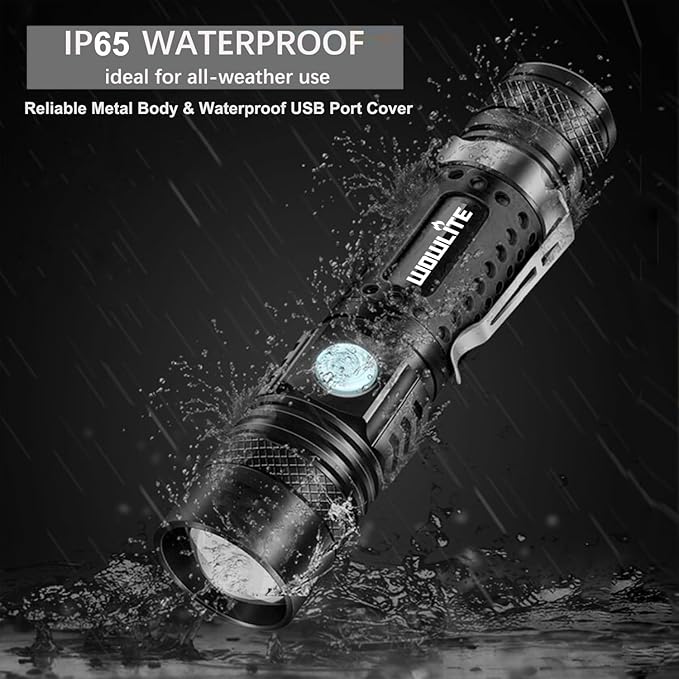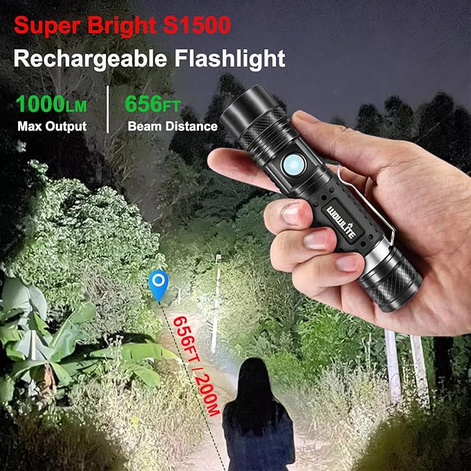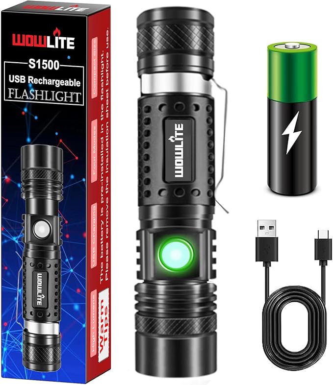wowlite Flashlight Rechargeable, Super Bright Pocket LED Flashlights with 4 Modes, Zoomable High Lumens Small Flash Light for Home Emergency, Gifts for Camping Essentials Camper Gear (Black)