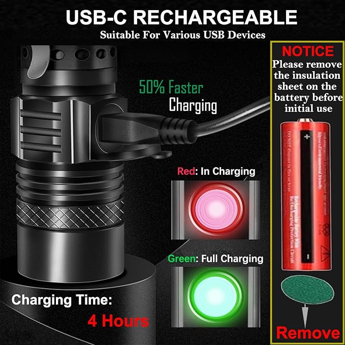 - 【USB C Rechargeable Flashlights】This compact flashlight has a high-capacity rechargeable battery, enough to support 5-10 hours of lighting. You can charge this flashlight directly with the USB-C cable. It features an anti-reverse installation function-protected circuit to ensure you have quality light and safety