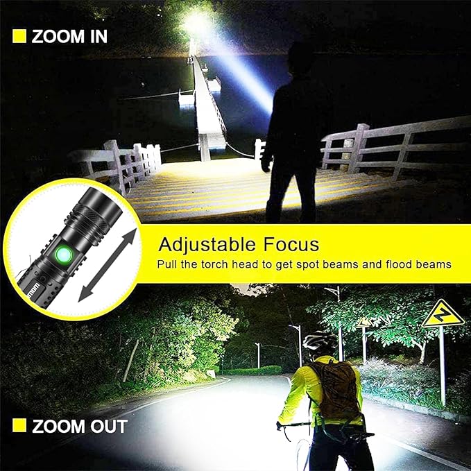 - 【4 Modes & Zoomable Flash Light】Easy to use, one button control the 4 lighting modes: High / Low / Strobe / SOS. The LED flashlight is zoomable which can adjust the focus, and you can choose a spotlight for long distances or a floodlight for wider illuminated areas as you like