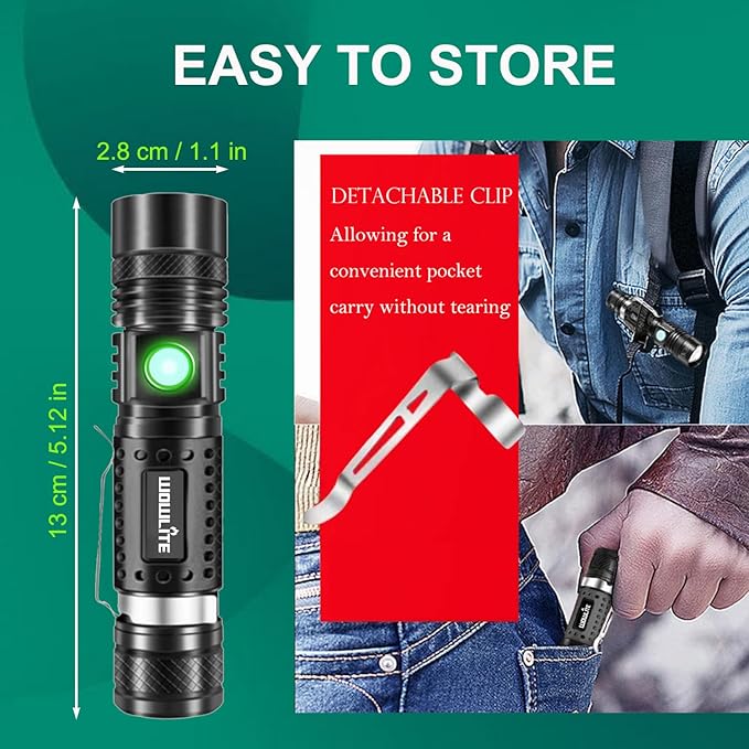 - 【Sturdy & Water-resistant Led Flashlight】The tactical flashlight shell is made of hard aluminum alloy with IP65 water-resistance. It's sturdy and portable and can withstand various collisions and falls. Pocket size and clip design turns the torch flashlight into a handheld light that can be clipped onto clothing or handbag