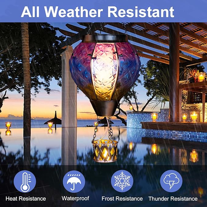- Hot Air Balloon Solar Lanterns:The solar lanterns outdoor waterproof has a unique design that incorporates the classic elements of a hot air balloon. Its shape resembles a hot air balloon floating in the air, with a candlestick hanging below. Coupled with the flickering flame design and rainbow-like colorful gradient colors, the outdoor lantern is full of dreamy atmosphere, creating a warm and romantic atmosphere for your garden.