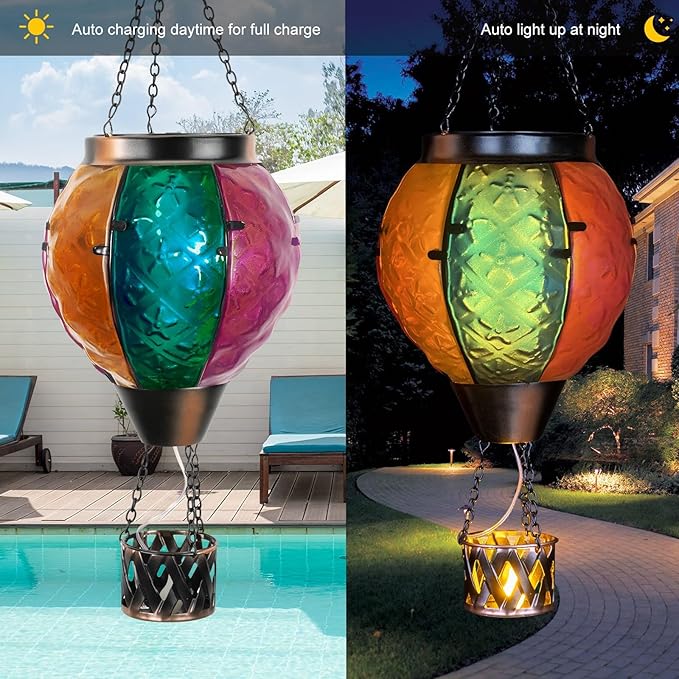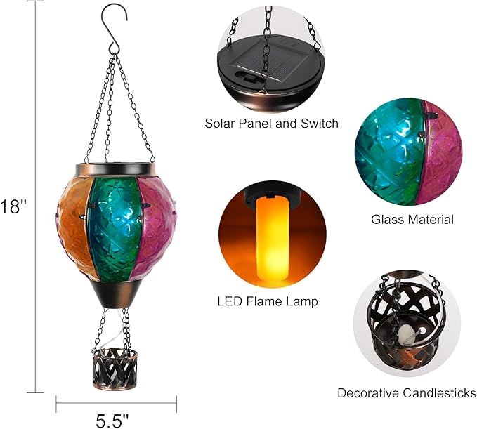 - Hot Air Balloon Design:The gradient color solar hot air balloon is made of thick glass and a realistic flame lights. When the sun goes down, the flickering flame, which is perfect for decorating your garden, effects resembles a real hot air balloon.