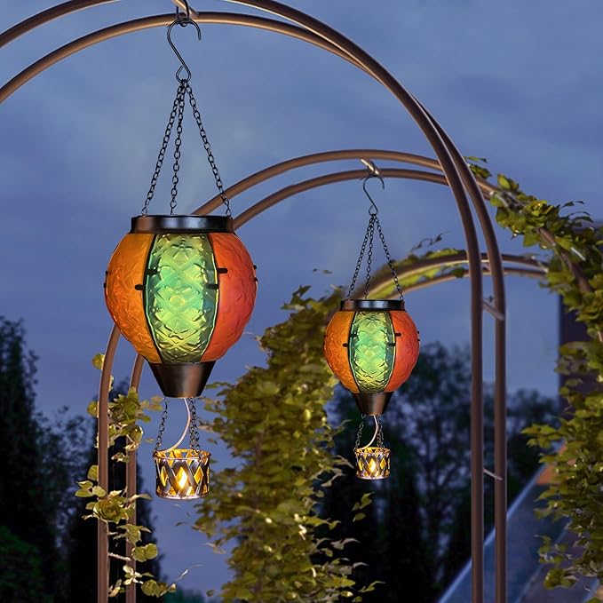 - Wide Application:Solar hot air balloon hanging garden light with metal "S" hooks can be easily hung anywhere, such as balconies,porches,ledges or trees.adding a cozy and romantic atmosphere to your home at night.