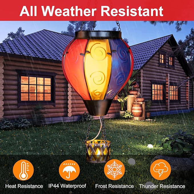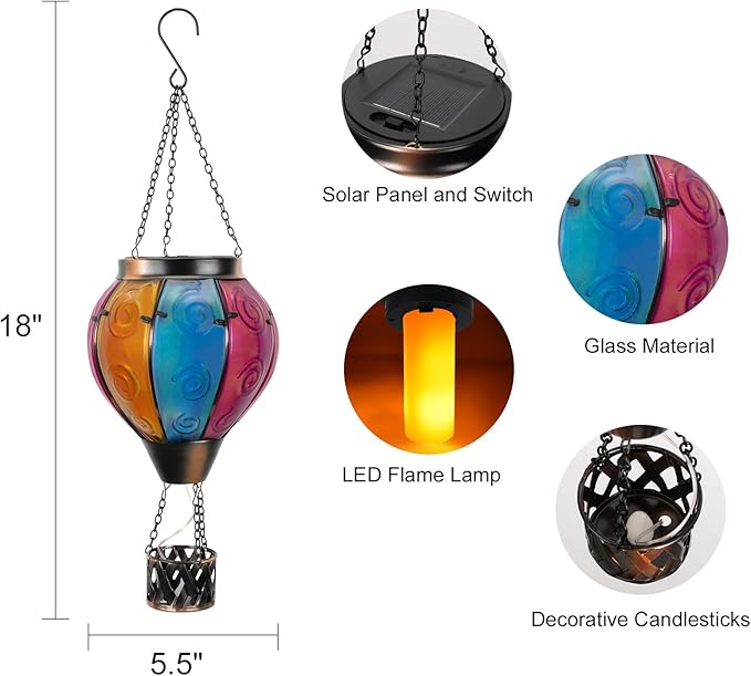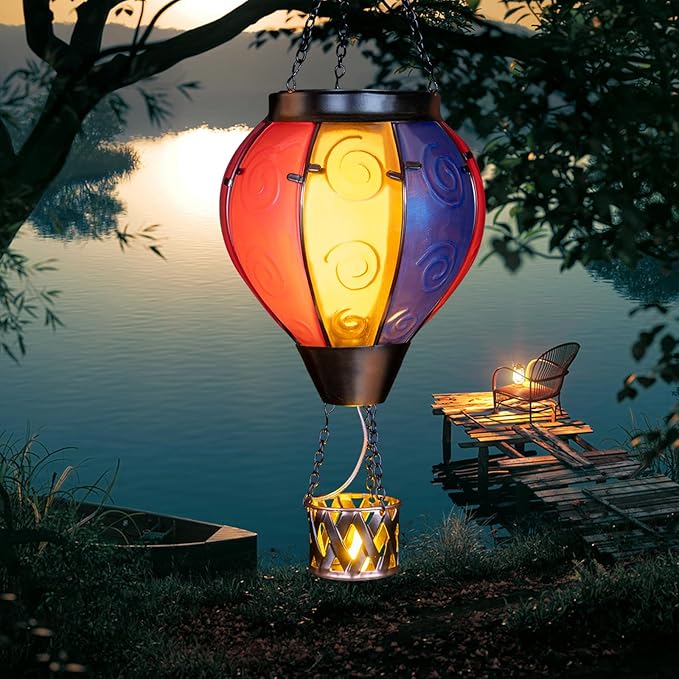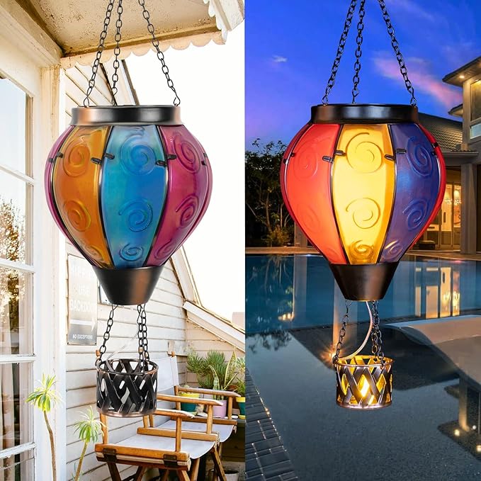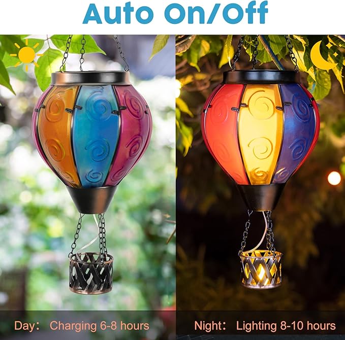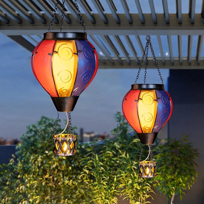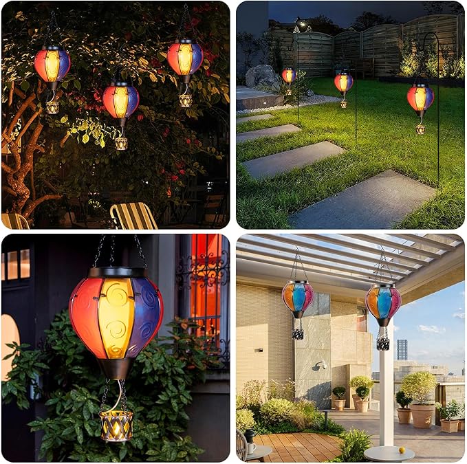 - Hot Air Balloon Solar Lantern:Our hanging solar lanterns have been updated with bright colors, unique hot air balloon shapes and small candles in the basket. When the hot air balloon solar lantern is lit, the flashing flame lamp and the candlelight in the basket make it more like a hot air balloon that is rising, creating a stunning visual effect, and also placing our good wishes to give people warmth.