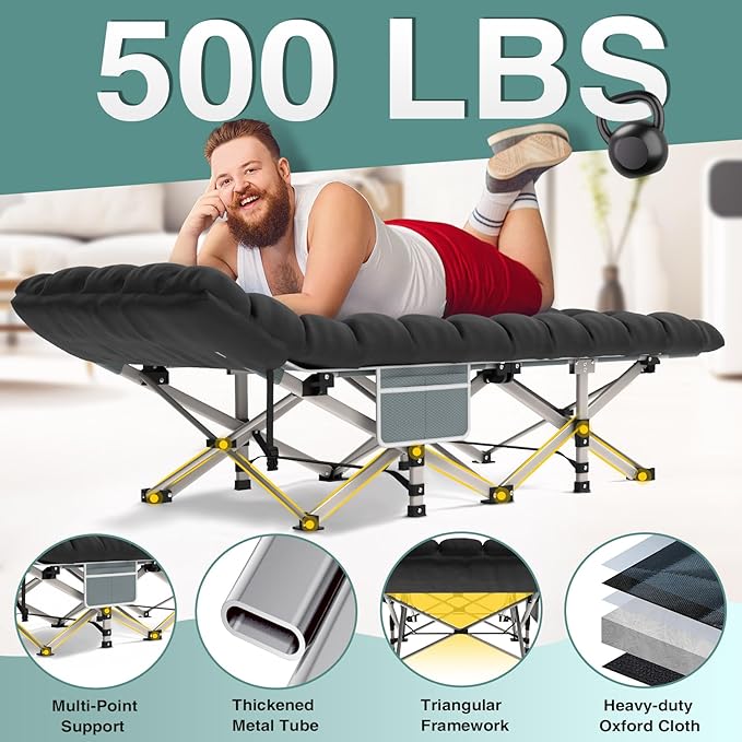 - 【Sturdy and Stable】Feel confident resting on a camping cot bed designed to support up to 500 lbs. The enhanced structure boasts 10 tubular iron legs with 25 mm thick flat round square tubes, ensuring uniform force distribution for a stronger, more stable sleep. The non-slip plastic nubs keep the cot secure on any terrain, ensuring a safe, worry-free slumber under the stars.